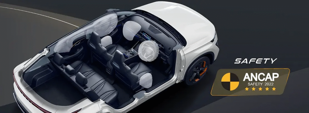 Comprehensive protection with 6 airbags: Main/passenger seat airbag, front side airbags, extra long side airbags, front center airbag