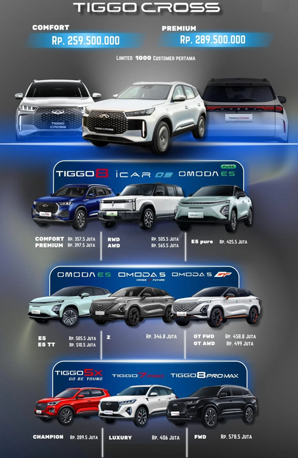 Nikmati pengalaman mengemudi mobil CHERY dengan performa tinggi dan teknologi canggih.