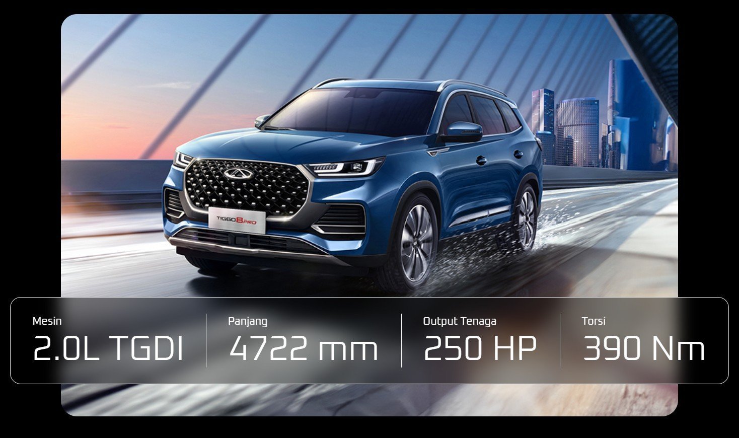 Tiggo 8 Pro memiliki akselerasi dan kecepatan yang sangat memadai untuk melaju di segala situasi dan kondisi. Menjadikan Anda pemimpin di kelasnya. Mesin Turbo ini dapat menghasilkan tenaga sebesar 250 HP. Tiggo 8 Pro dibangun di atas platform T1X. Sasis ini sengaja dibuat untuk memungkinkan ruang kepala yang lebih baik untuk kursi depan dan belakang, serta ground clearance yang lebih tinggi. Sudut pendekatan dan keberangkatan yang tinggi juga memastikan performa off-road yang lebih baik jika dan saat diperlukan.